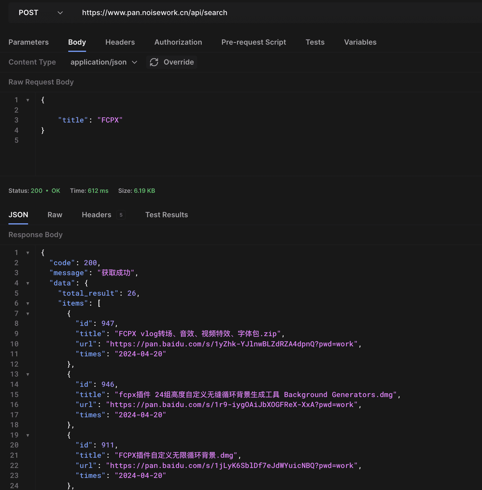 你只需要post发送 站点域名/api/search 发送字段title=你要查询的文字即可查看,其它字段如page页数等不必输入