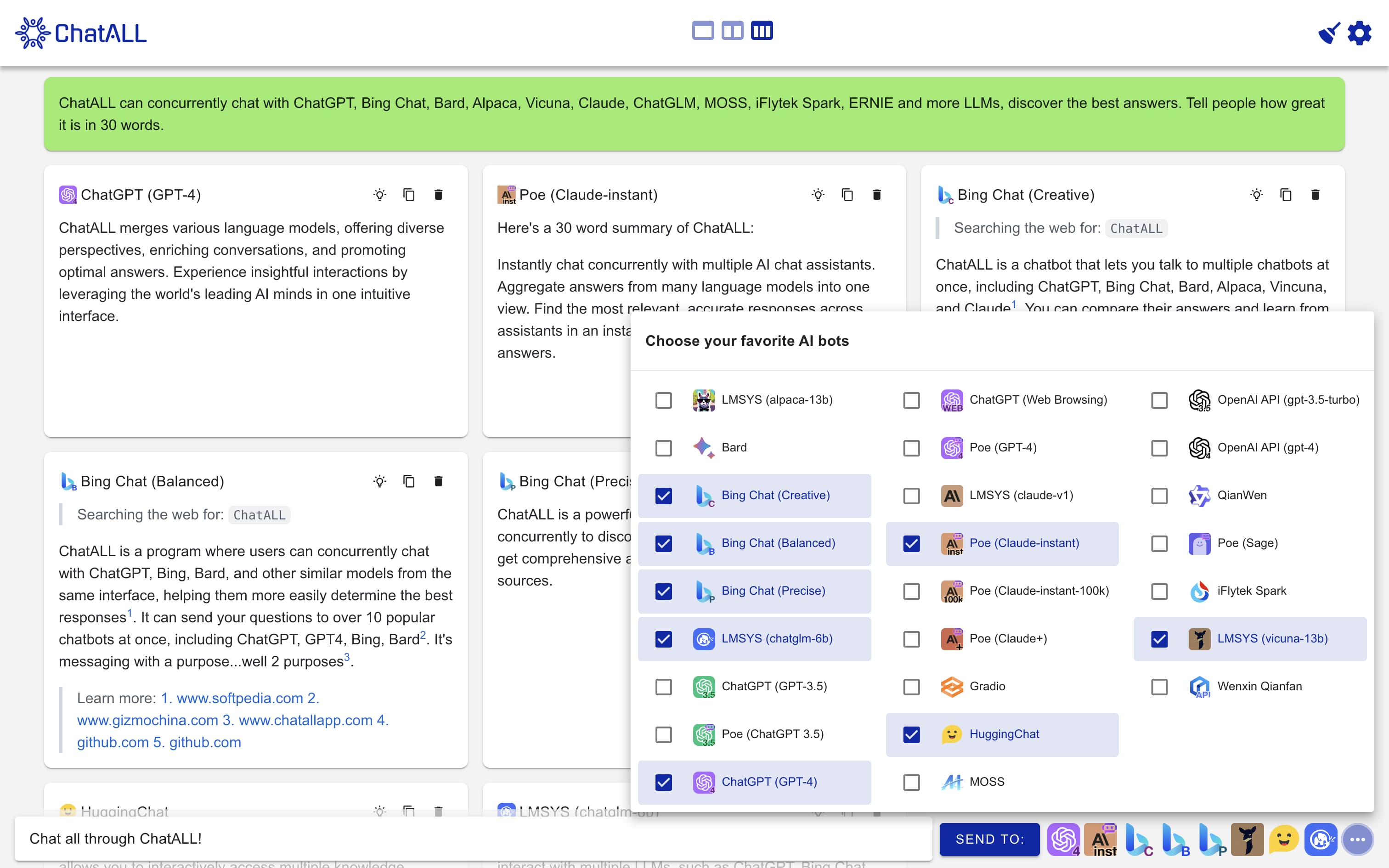 ChatALL是基于大型语言模型(LLMs)的 AI 机器人,不同的机器人在不同的任务上表现也有差异。如果你想获得最佳体验,不要一个一个尝试。ChatALL(中文名:齐叨)可以把一条指令同时发给多个 AI,帮助您发现最好的回答。