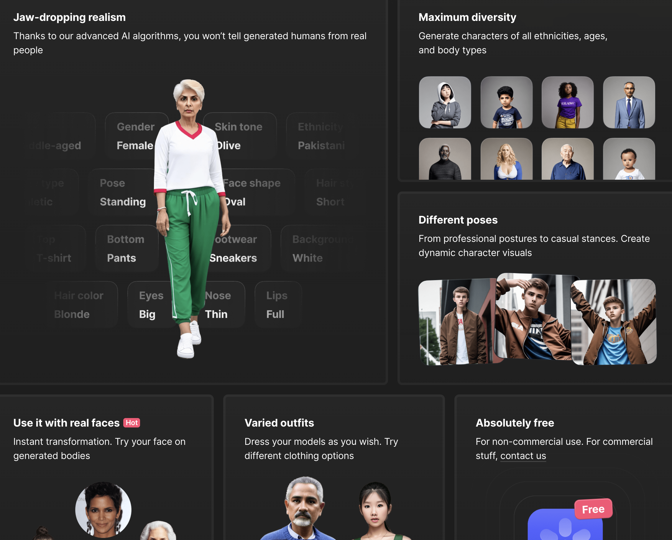 generated是一款实时创建超逼真人物全身照片的AI程序,只需要点击选择即可实现不同人物、不同肤色、不同动作的转换生成,免费用于非商业用途,生成的照片的分辨率从 512x512 到 1024x1024 像素不等。输出格式为 JPG