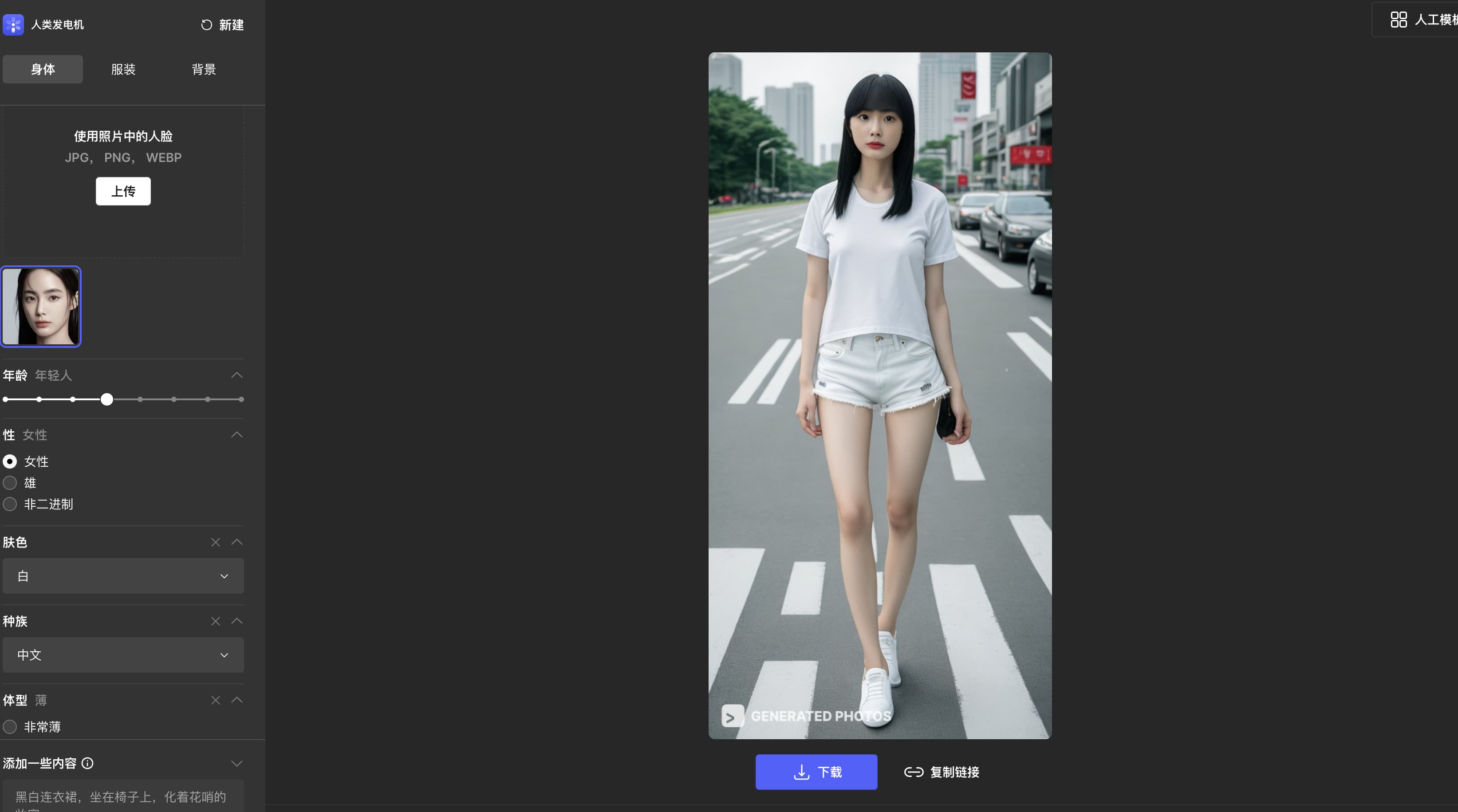 服装、鞋子可以使用模版中的,也可以在左下方的提示词中输入你的具体要求,如白色连衣裙等。