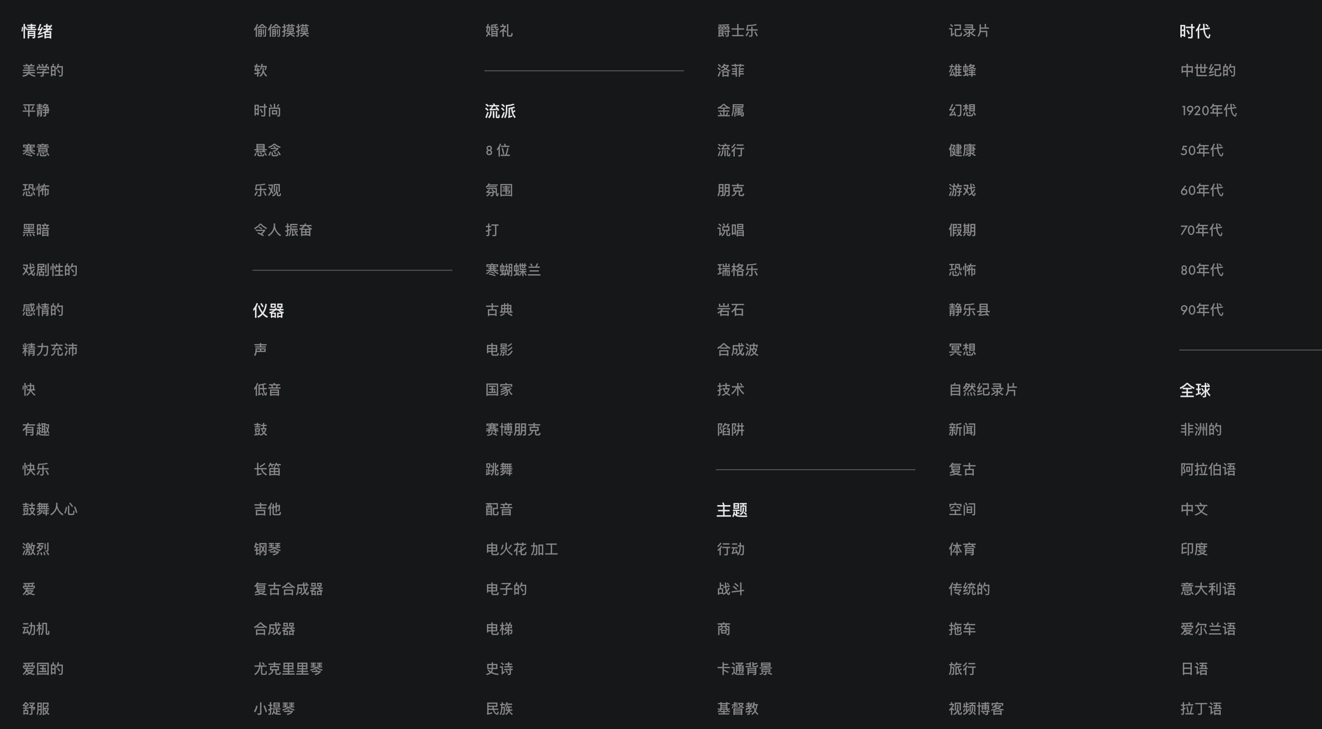它的音乐分类很细,不同风格场景及由创作者精选的列表等组成