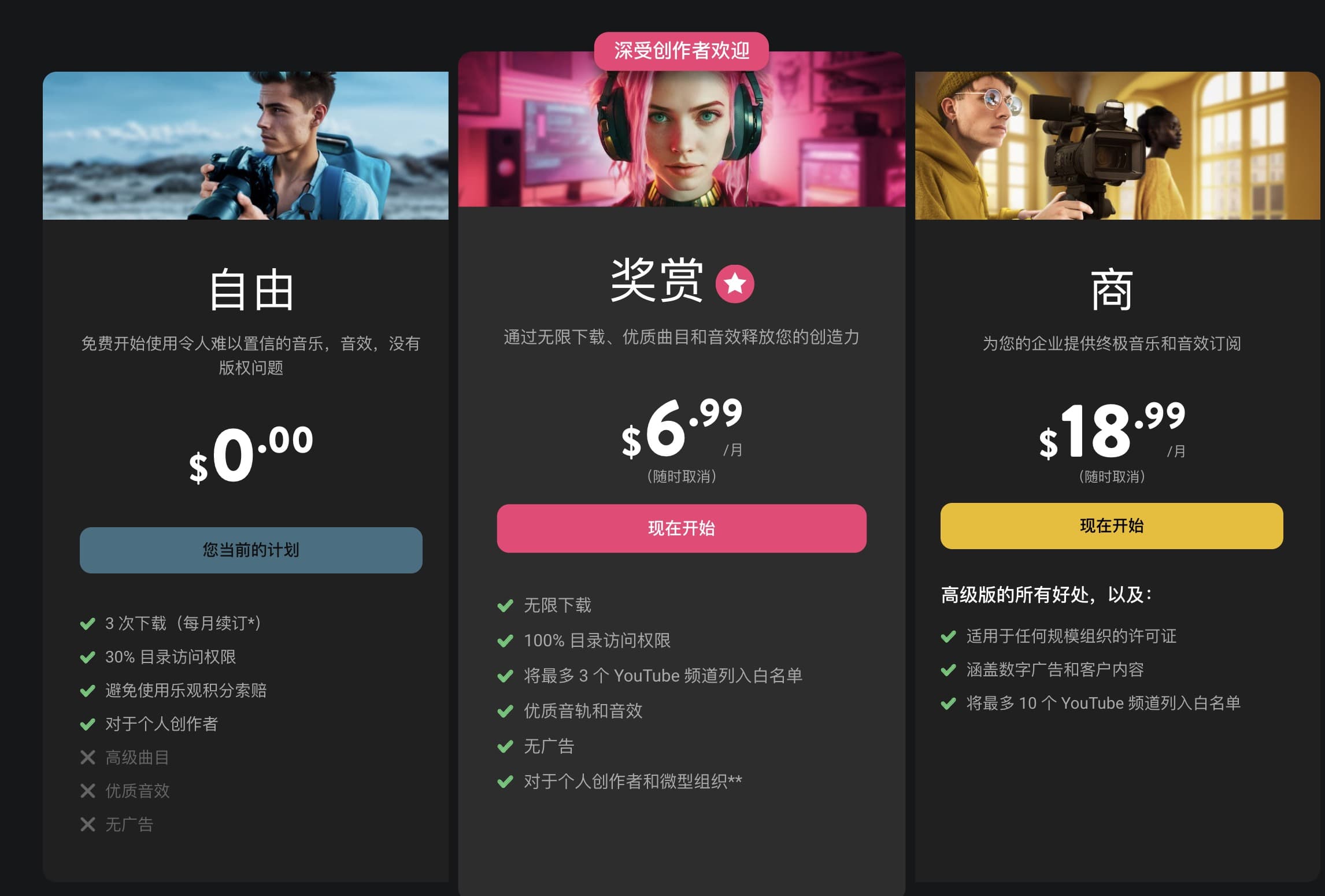免费版每月提供三次下载及百分之三十目录的权限【是不是觉得很少,但我要告诉你的是它的音乐没有music水印,意思你懂的,我不鼓励其它非法途径获取,但如果你真的喜欢它,每月7美元并不贵!】